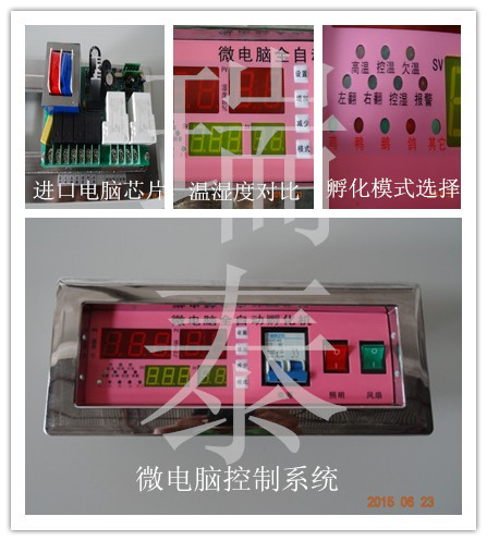 3、控制器:由电脑主板和温湿度探头组成.孵化机中的重要组成部分,所有电路均有它来控制(相当于人体的大脑神经系统),温湿度探头的作用是精确的把孵化机内的温湿度传感到控制器显示屏.
